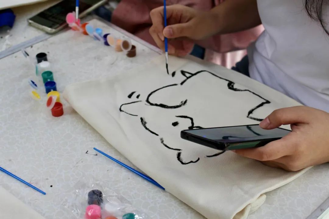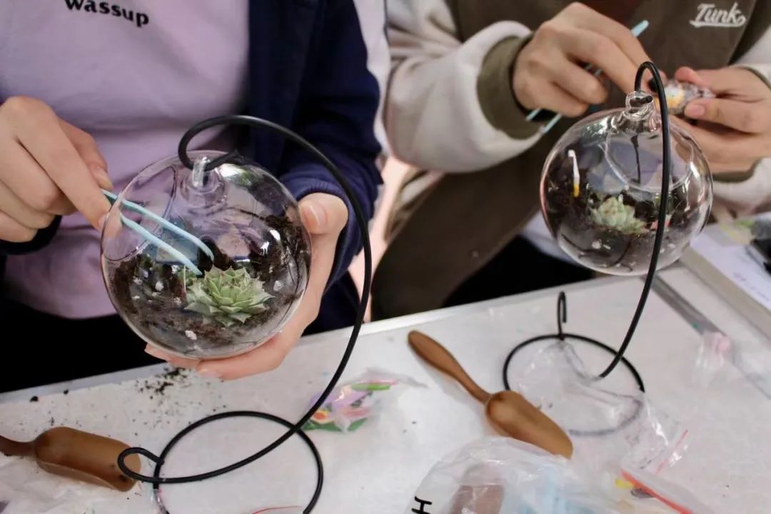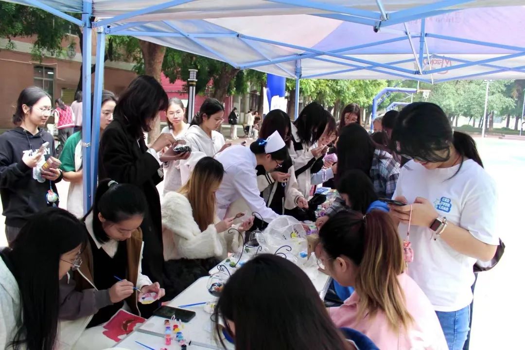 活动从早上9点持续到下午6点,两校区的学生们在生活园篮球场和旧饭堂前的摊位上积极参与各种活动。其中,帆布袋DIY涂鸦和微景观创造活动受到特别欢迎,学生们席地而坐尽展才艺,释放自我,感受了心灵上的轻松和快乐。串珠、香囊制作也逐步激发了学生们的审美感受力和创造力,短时间内编作出琳琅满目的手链和香囊,同学们纷纷表示在手工创作的过程中既找到了内心的平静又悄然的释放了压力。