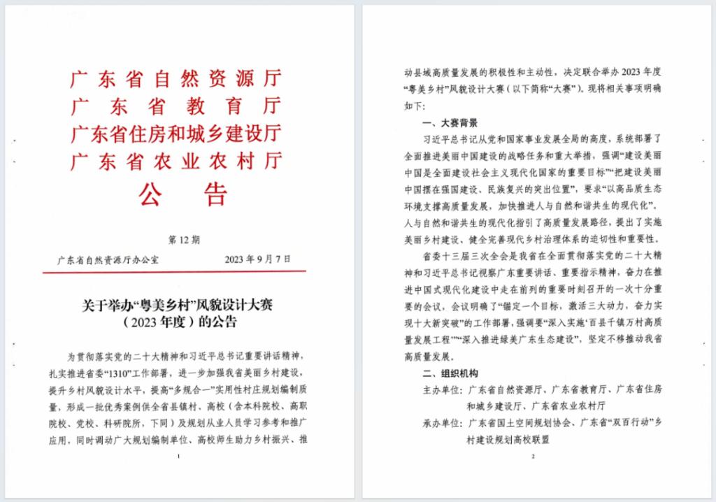 2023年度“粤美乡村”风貌设计大赛由广东省自然资源厅、广东省教育厅、广东省住房和城乡建设厅以及广东省农业农村厅联合举办。参赛作品设计对象重点为百校联百县助力“百县千镇万村高质量发展工程”行动结对县镇以及“百千万工程”美丽坪镇试点、中心镇试点、农房试点县、示范村。设计内容针对县域民风民俗建筑特色,重点围绕当地美丽坪镇建设、农村“赤膊房"美化,以及乡镇“七个一"设计 (美丽乡镇入口通道、美丽示范主街、房屋外立面提升样板、美丽坪镇客厅、干净整洁农贸市场、美丽河道、绿美生态小公园) ,打造“一镇一品”、“一村一貌”示范样板。