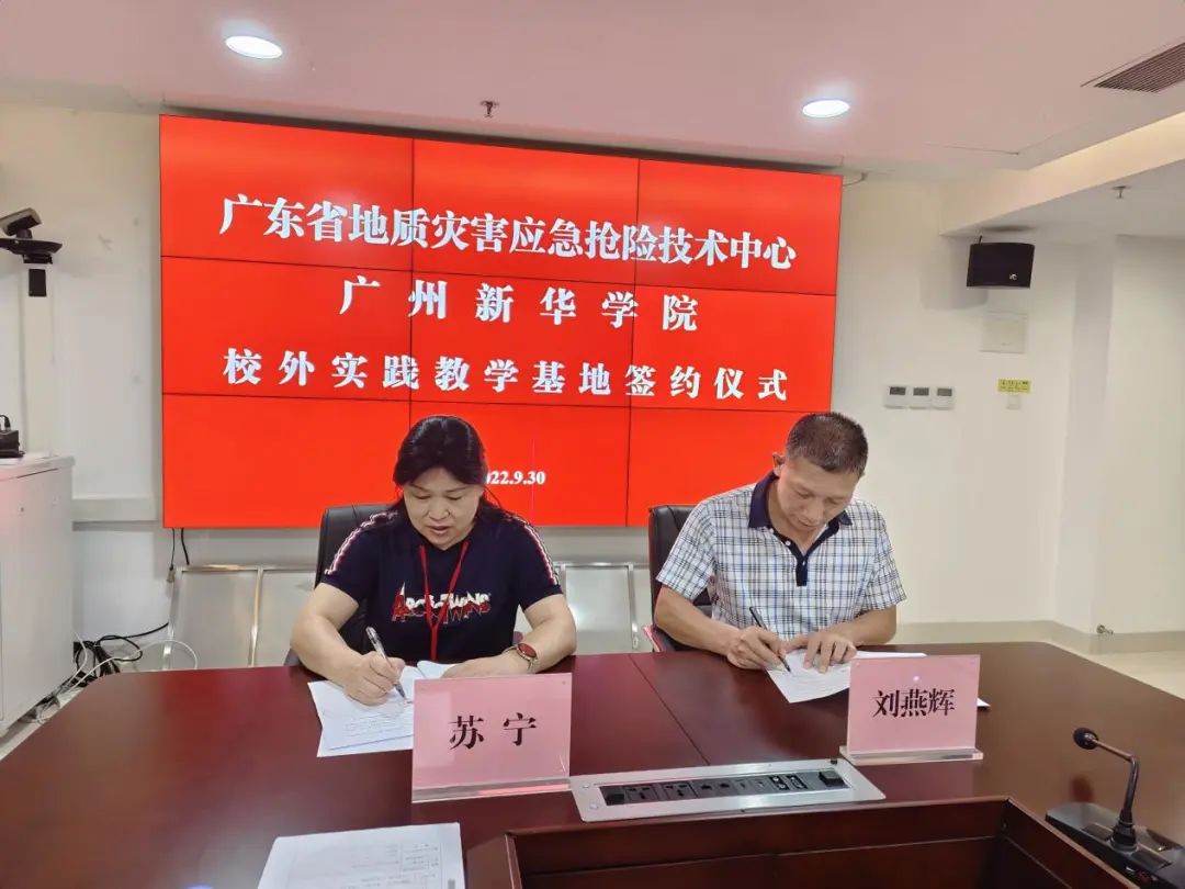 suncitygroup太阳集团教务处处长苏宁(左)与广东省地质灾害应急抢险技术中心主任刘燕辉(右)共签合作协议