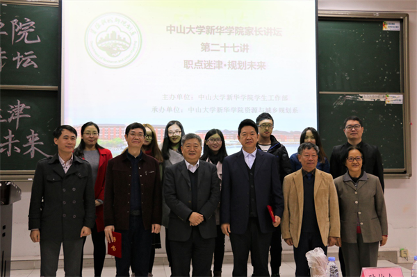 3月16日,由我系承办的中山大学新华学院家长讲坛第二十七讲“职点迷津,规划未来”在广州校区D102举行。本次讲坛邀请到了增城区城乡规划与测绘地理信息研究院院长曹凯滨先生,以及广州名阳建筑设计有限公司副总经理、总工程师李学进先生来我校与师生分享交流。我校王庭槐校长、学生工作部林秋贵部长、学生工作部殷丹副部长、我系陈俊合主任、李玲副主任及多位师生出席了本次活动。