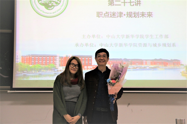 在随后开始的嘉宾主讲环节中,曹凯滨先生从一位规划测绘院院长的视角为师生们解读了规划师的成长和要求,在带大家领略增城的自然与人文之余,围绕规划院如何编制城乡规划、需要什么样的规划人才等主题进行了剖析,并鼓励同学们把握18岁至28岁这个阶段,做好职业的规划。曹先生指出,作为一个规划人,应该善于在日常工作和生活中发现和挖掘城市的人文特点,及时关注政府政策与城市发展方向,还必须具备空间表达与分析能力、学习能力、写作能力、空间思维能力和时间尺度。
