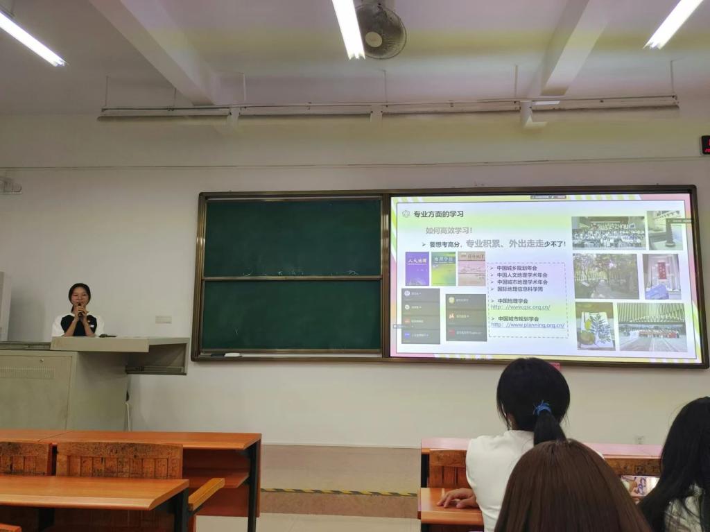 随后,会议进入第二项议程,学生党员冯凯淇同志为同学们带来了宝贵的学习经验分享。她详细介绍了本专业的学习内容,包括人文地理与城乡规划专业的核心课程、实践项目,帮助同学们对专业有了更全面的认识。此外,她还对公选课的修读要求进行了细致的解读,强调了同学们要合理安排自己的时间把创新创业课与美育课的学分修满。