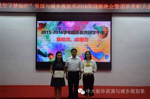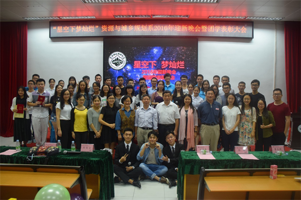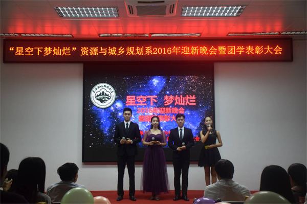 2016年10月19日晚,我系于广州校区教学楼D101举办了“星空下•梦灿烂”2016迎新晚会暨团学表彰大会。学院工会主席刘美南研究员、系主任陈俊合教授、副主任李玲副教授、人文地理与城乡规划专业学科带头人林琳教授、自然地理与资源环境专业学科带头人董玉祥教授等师生共计200余人出席了晚会。